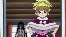 After Prince Momoze's sudden death at the hands of one of her bodyguards, Biscuit tries to console a furious Hanzo who blames himself for not beingness able to salvage her. Mindful that asking him may make him even angrier, she still asks anyway what his programme is, hoping to help him calm downward. He thinks that the murderer used a clone and that he was i of the ii bodyguards on intermission at the time of Momoze's death. Beige agrees with his assessment, and Hanzo swears to her that he volition brand the murderer pay. Worried, Biscuit tells him to go some remainder.[61] Later, the ii notice the changes in Marayam's Nen beast, which Biscuit attributes to his growing inner turmoil. When their shift ends, Hanzo tasks her with watching over his body while he uses his ability to look for Momoze's killer, which Biscuit agrees to in return for a nature beauty pack. When he comes back, withal, Hanzo finds that Beige and his body are gone.[62] Unbeknownst to her, she and everyone else in Room 1013 have been cutting off from the rest of the globe by a Nen power.[63]